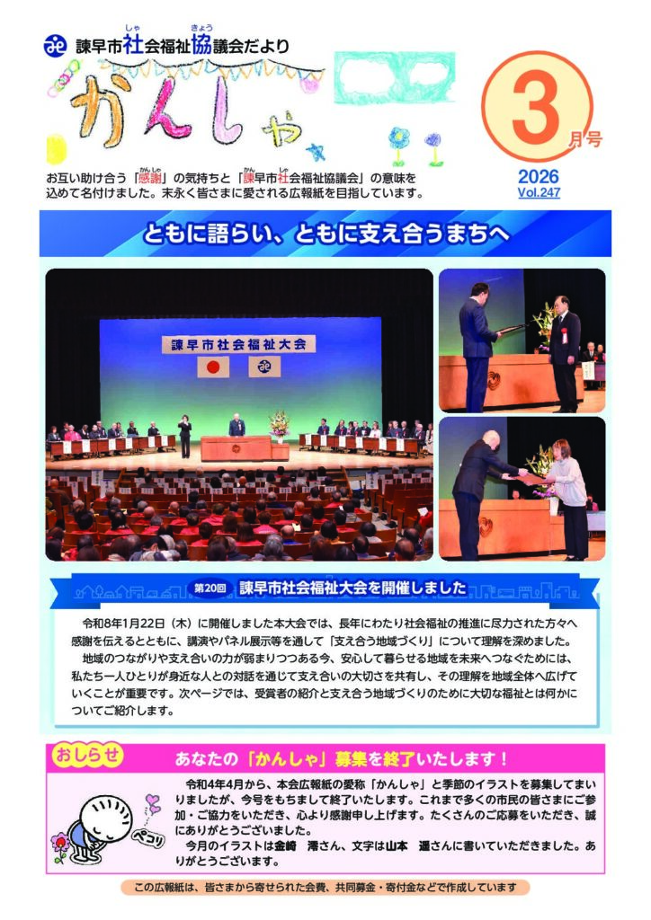 令和8年1月22日(木)、諫早文化会館にて「第20回諫早市社会福祉大会」を開催しました。 大会では、長年にわたり社会福祉の推進にご尽力された方々へ、「諫早市社会福祉協議会表彰」(個人33名)「出口ボランティア表彰」(奨励 […] -