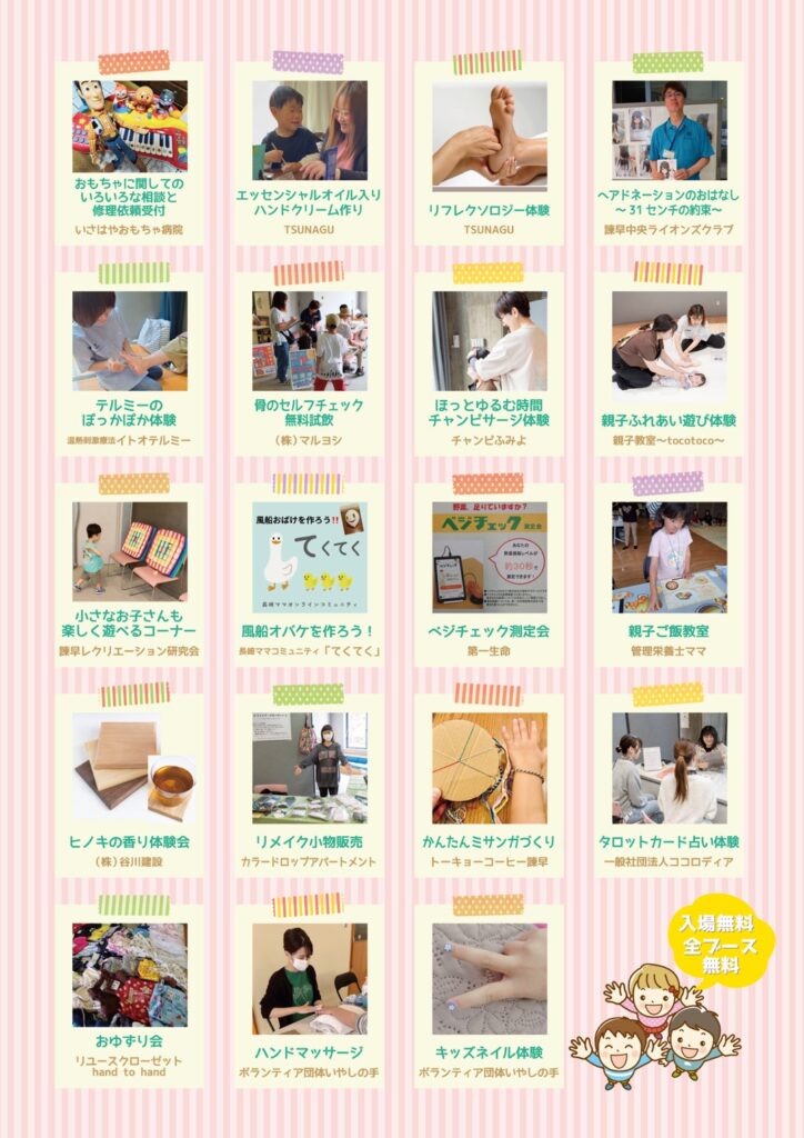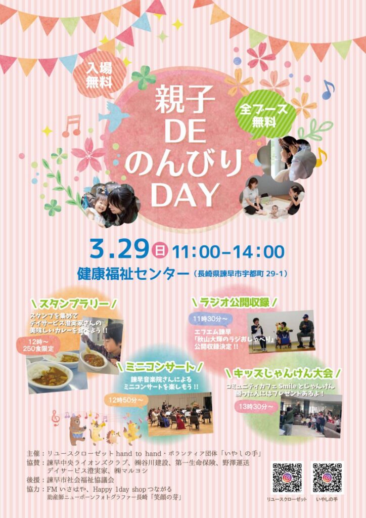 ボランティアセンター登録団体「リユースクローゼットhand to hand」「ボランティア団体 いやしの手」からのお知らせです。 この度、第5回目となる「親子DEのんびりDAY」が開催されます。コンセプトは、「子どもは楽しく。ママやパパはちょっとひと休み。」です。 親子で様々な体験ができる、楽しいブースがたくさん用意されています。 ご興味のある方はお出かけください。