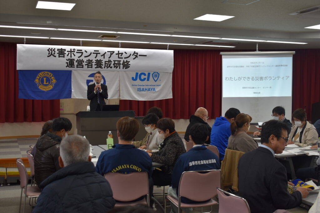 2月1日、災害ボランティアセンターの運営に携わる運営者を養成することを目的に研修会を開催し、本会と災害時相互応援協定を締結している諫早地区6ライオンズクラブや諫早青年会議所の会員のほか、一般の参加者など48名の参加がありました。