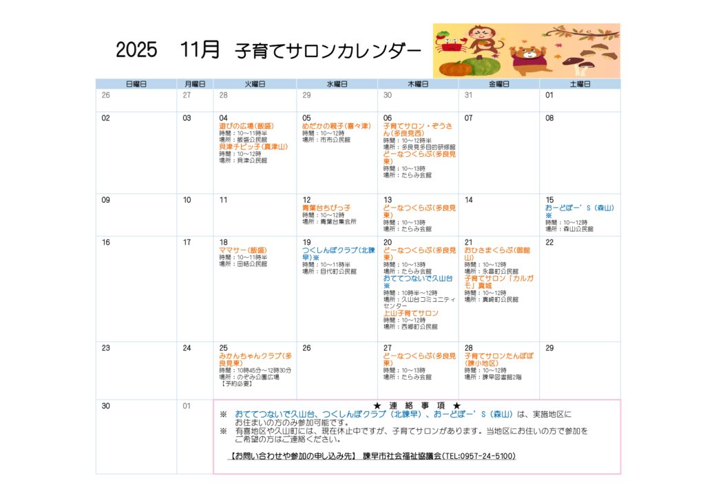 こちらをクリック👉令和7年11月子育てサロンカレンダー